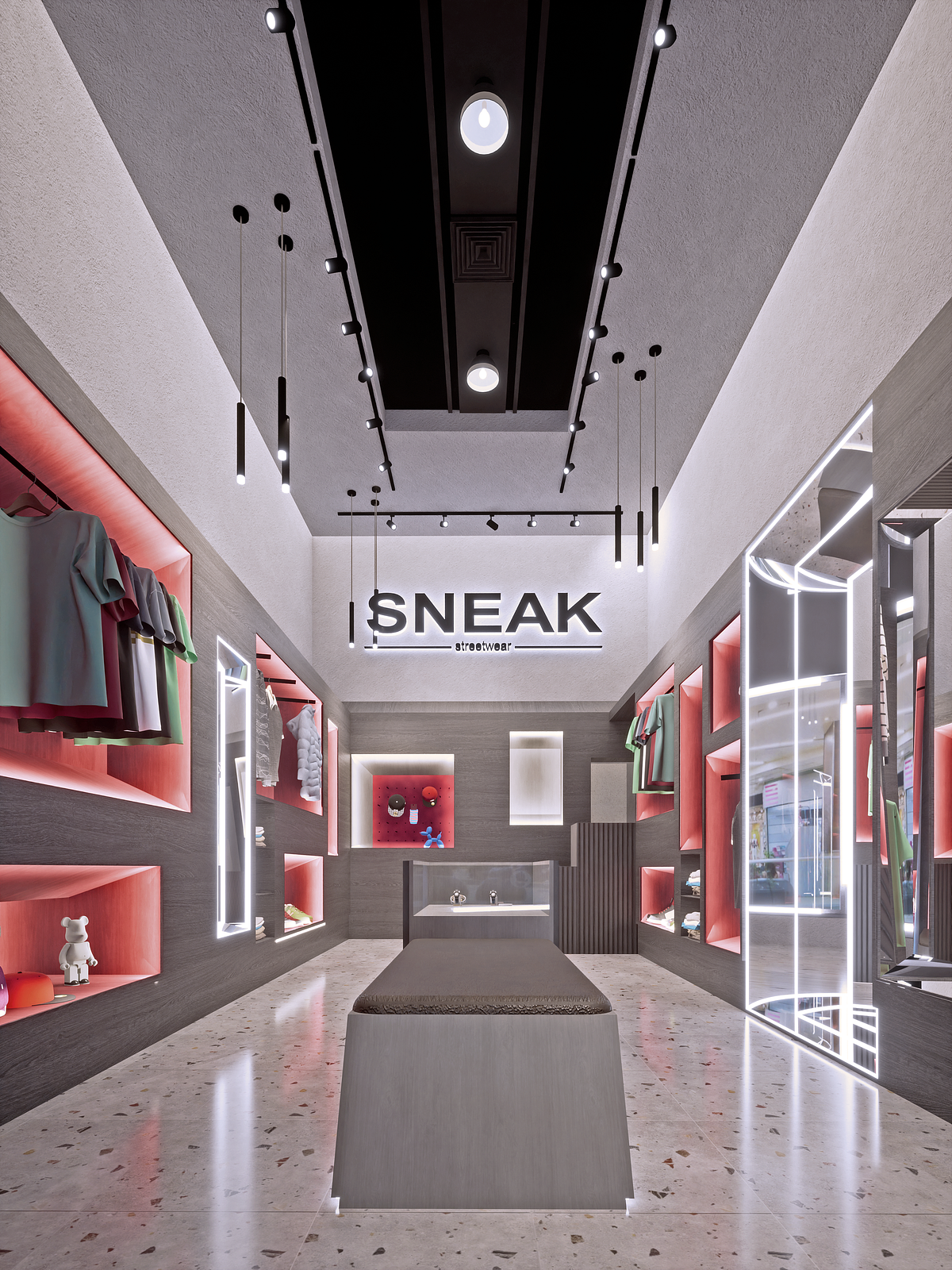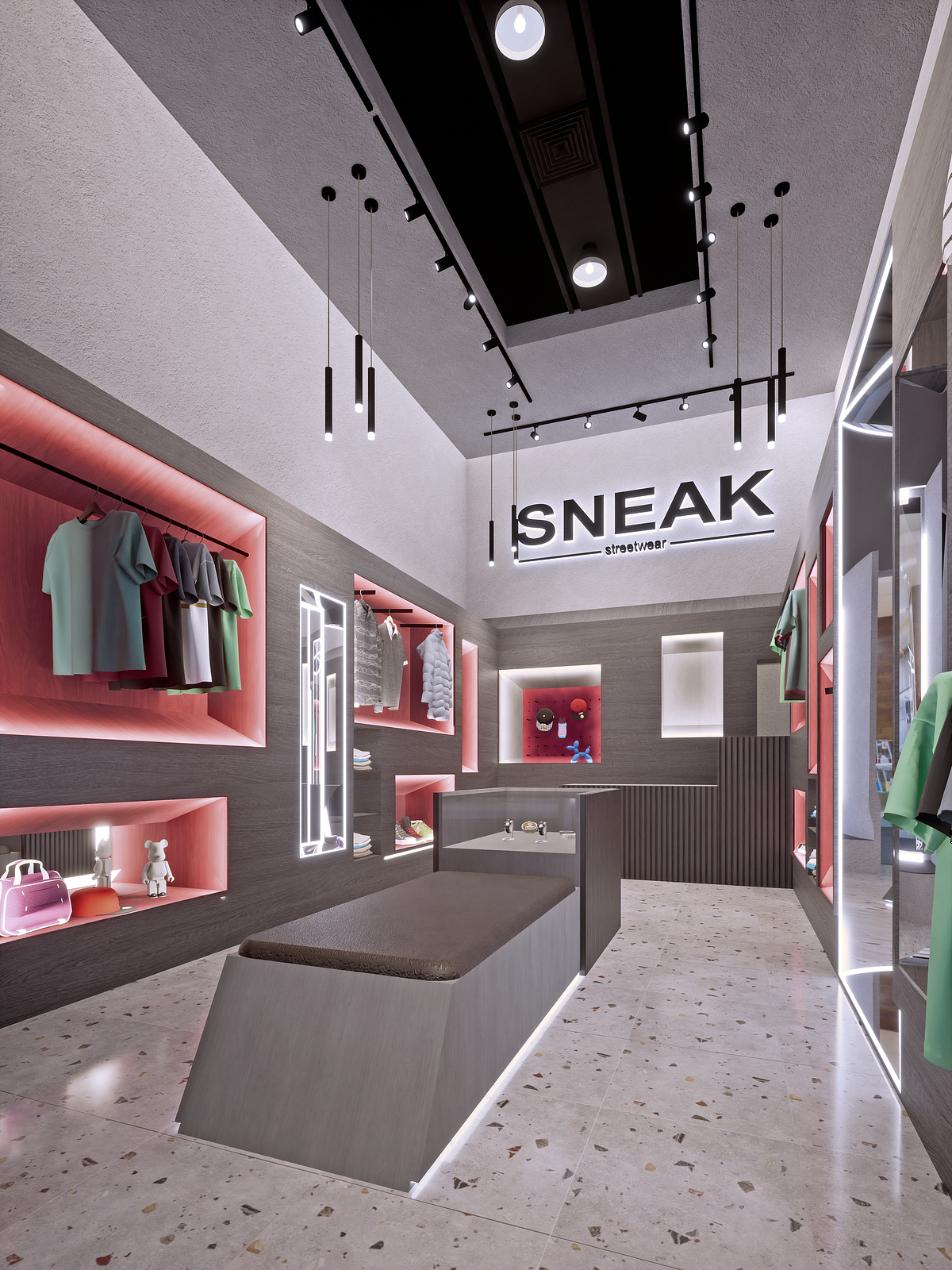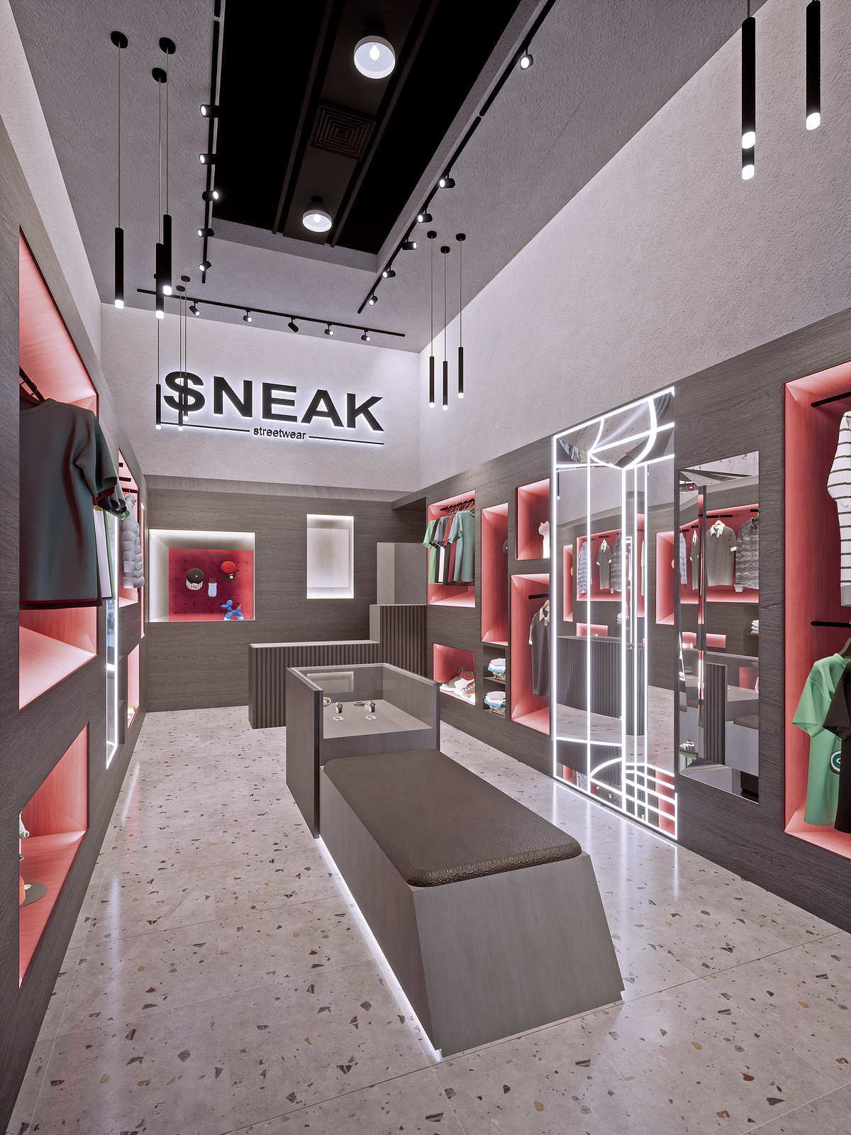 Después de entender la diversidad de productos, que iban desde accesorios a prendas de gran tamaño, se decidió que el proyecto se abordaría como un gran mueble adosado a las caras interiores y sus vacíos actuarían como espacios de exhibición y encuadre, adaptándose a las prendas y accesorios, dando protagonismo y cierto dinamismo visual.